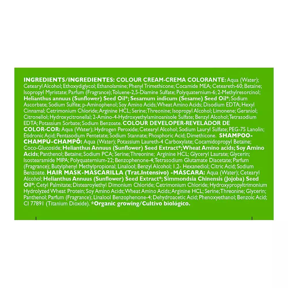 | Ingredients | Ingredientes: Aqua (Water); Cetearyl Alcohol; Ethoxydiglycol; Ethanolamine; Phenyl Trimethicone; Cocamide MEA; Ceteareth-60; Betaine; Isopropyl Myristate; Parfum (Fragrance); Toluene-2,5-Diamine Sulfate; Polyquaternium-6; 2-Methylresorcinol; Helianthus annuus (Sunflower) Seed Oil*; Sesamum indicum (Sesame) Seed Oil*; Sodium Ascorbate; Sodium Sulfite; p-Aminophenol; Soy Amino Acids; Wheat Amino Acids; Disodium EDTA; Hexyl Cinnamal; Cetrimonium Chloride; Arginine HCL; Serine; Threonine; Isopropyl Alcohol; Limonene; Geraniol; Citronellol; Hydroxycitronellal; 2-Amino-4- Hydroxyethylaminoanisole Sulfate; Benzyl Alcohol; Tetrasodium EDTA; Potassium Sorbate; Sodium Benzoate. REVELADOR DE COLOR-COLOUR DEVELOPER: Aqua (Water); Hydrogen Peroxide; Cetearyl Alcohol; Sodium Lauryl Sulfate; PEG-75 Lanolin; Etidronic Acid; Pentasodium Pentetate; Sodium Stannate; Phosphoric Acid; Dimethicone. |