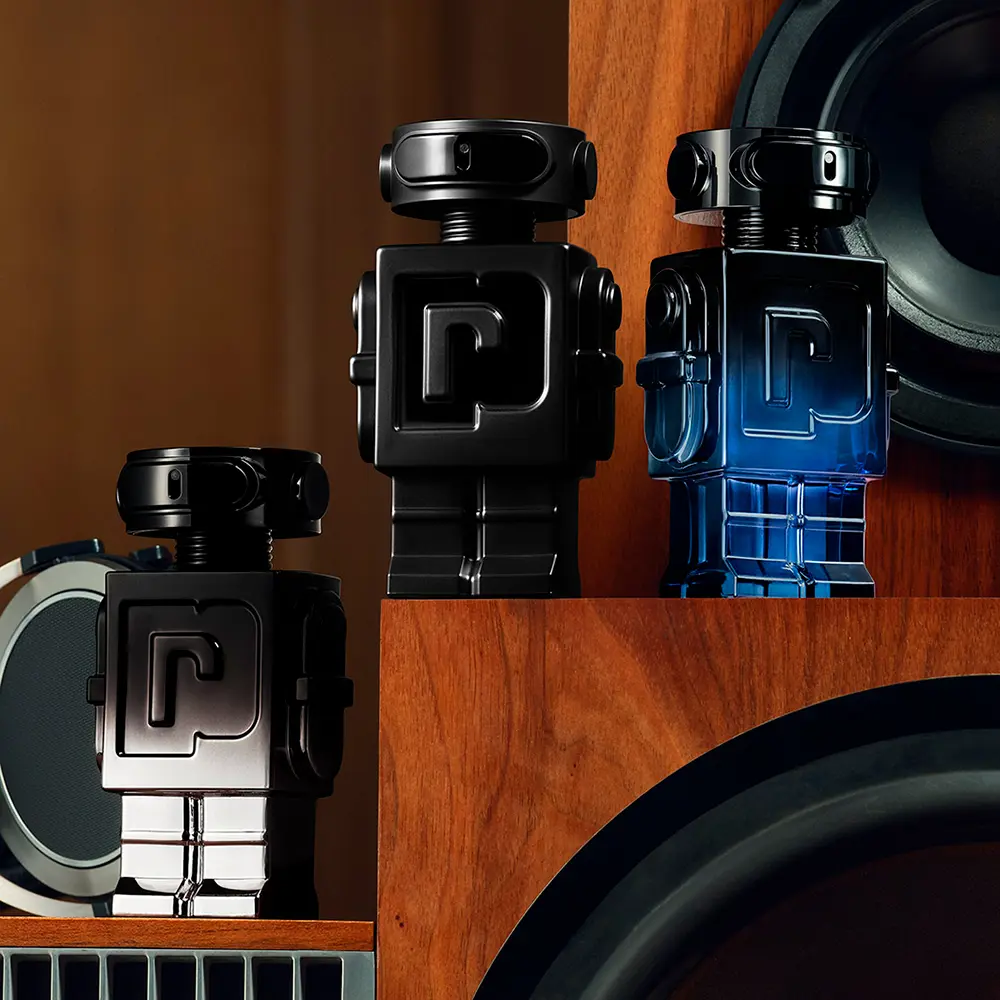 Encased in a bold, futuristic bottle that mirrors the fragrance’s magnetic energy. The iconic robot silhouette is reimagined with metallic midnight blue and chrome accents, capturing the spirit of innovation and sensuality at the heart of RABANNE PHANTOM ELIXIR.