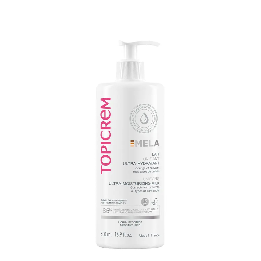 Introducing MELA Ultra-Moisturizing Unifying Body Milk SPF15+ by TOPICREM. Perfect for individuals seeking a body treatment that offers lightening, unifying, and moisturizing benefits. This formulation caters to all skin types, including sensitive skin, and is particularly suitable for women who prioritize safety in the treatments they choose