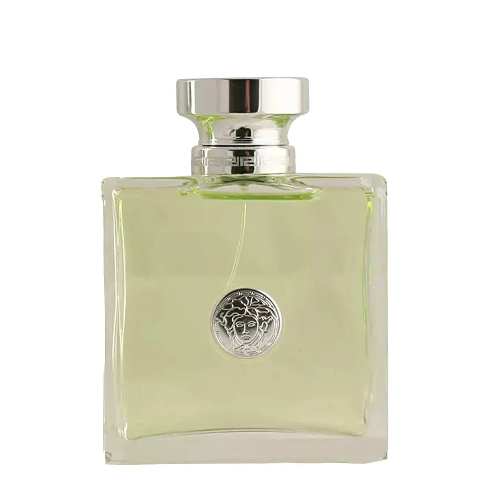Presented in a sleek, transparent bottle adorned with the iconic Versace Medusa emblem, the design reflects purity and freshness with its pale green hue. The silver detailing and clean lines evoke both luxury and understated sophistication, making it a statement piece on any vanity.